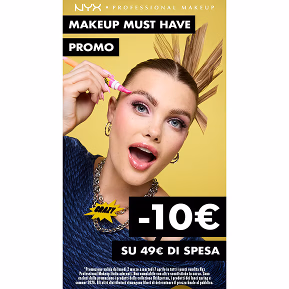 YOUR EYE-DEAL APRIL PROMO -50% ACQUISTA 3 PRODOTTI EYES IL MENO CARO LO PAGHI LA METÀ! *Promozione valida dall'8 aprile al 3 maggio 2026 in tutti i punti vendita Nyx Professional Makeup Italia aderenti. Non cumulabile con altre scontistiche in corso. Sono esclusi dalla promozione i prodotti dei lanci spring e summer 2026 e della collezione Simpson. Gli altri distributori rimangono liberi di determinare il prezzo finale al pubblico.